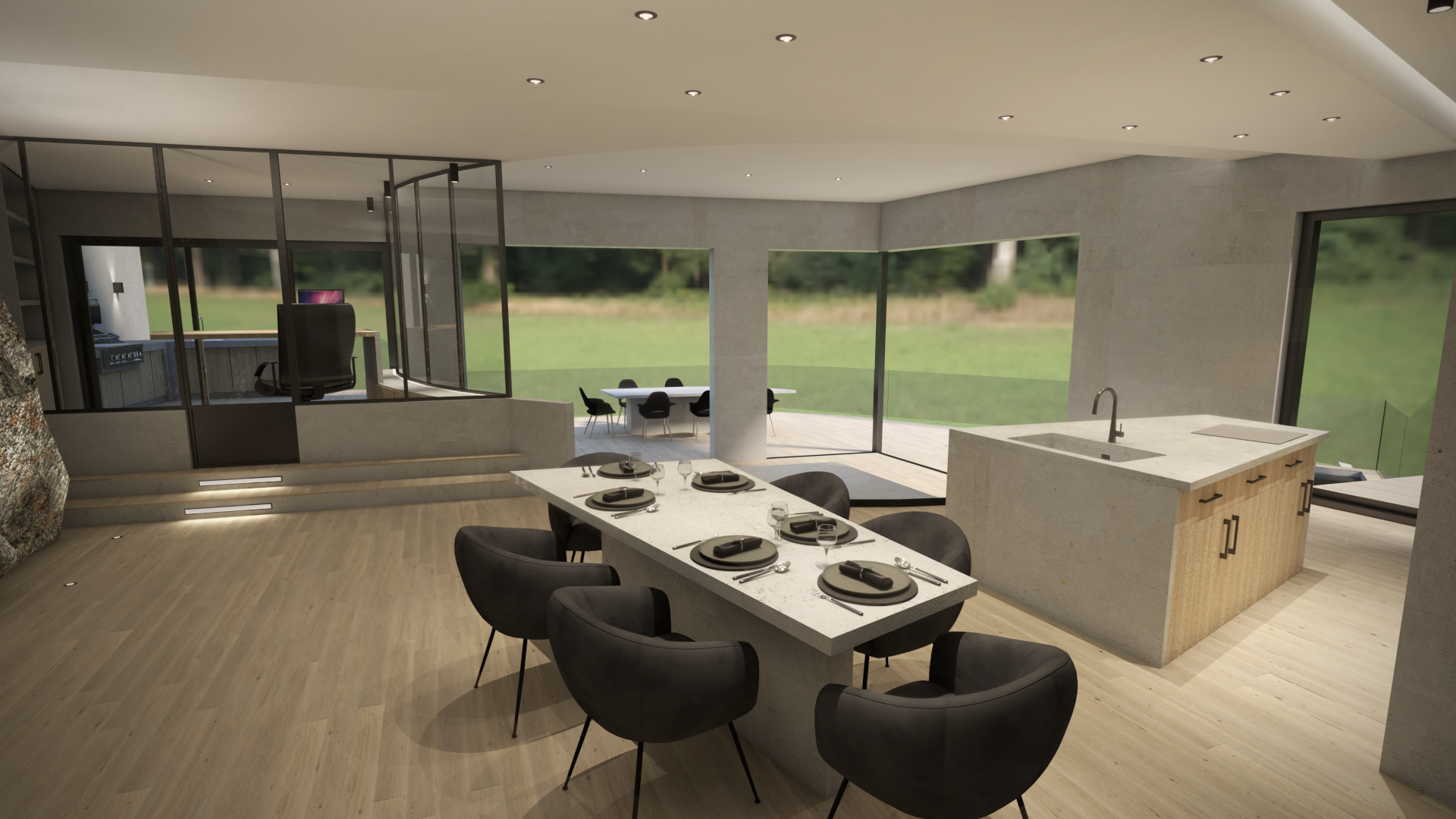 Cette fluidité est est également accentuée par le traitement des matériaux. En effet, nous avons décidé de traiter l’intérieur et l’extérieur avec les mêmes matériaux à la fois le parquet au sol, mais aussi avec la forte présence du béton ciré.