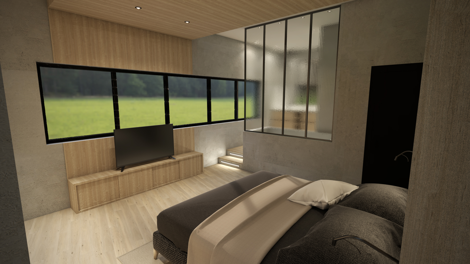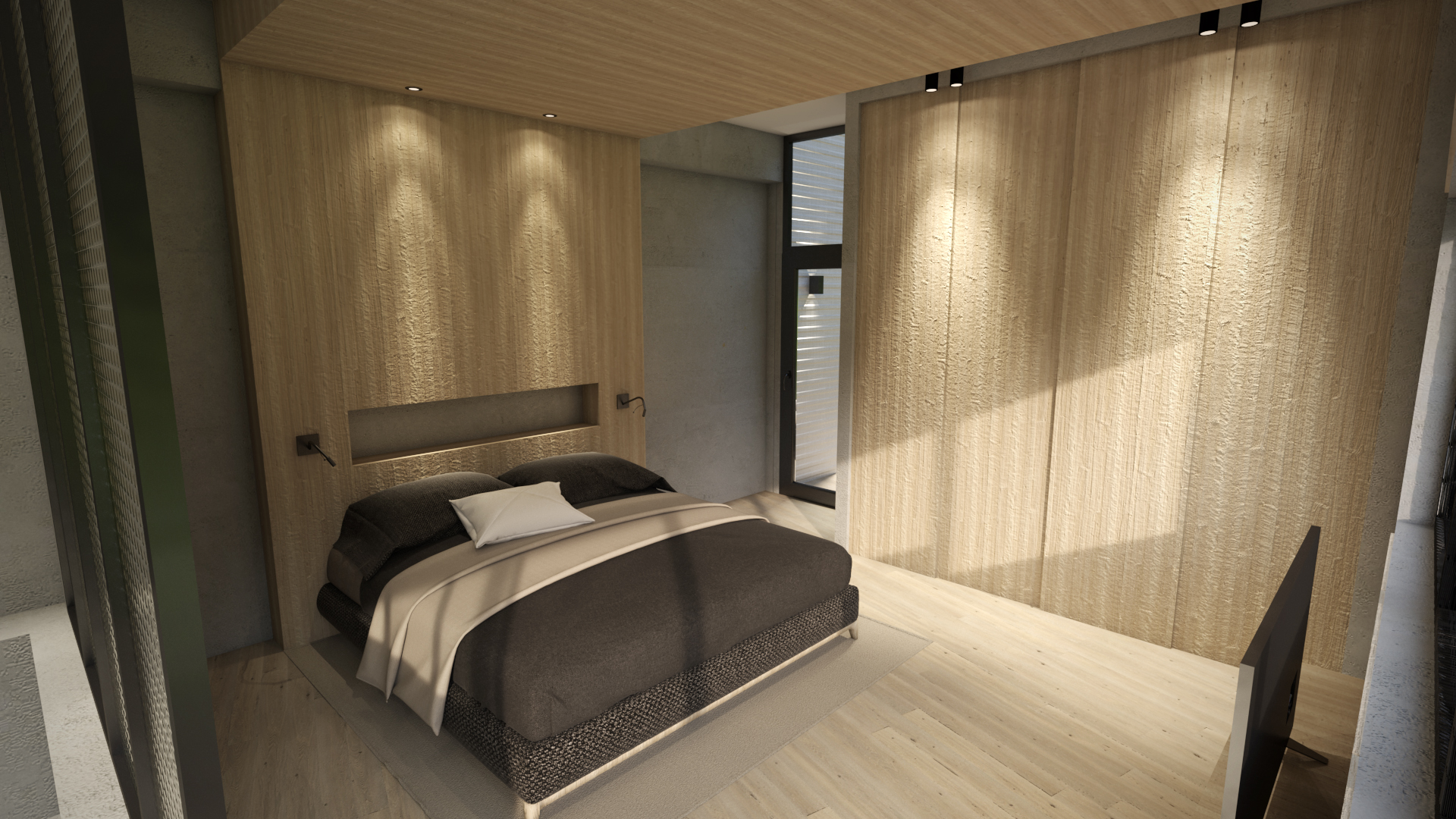 Toujours dans un objectif de détente, l’espace est minimaliste et minéral tout en ajoutant plus de bois que dans l’espace de vie pour apporter un aspect plus chaleureux et intime; on vient encadrer le lit afin de créer un cocon, une enveloppe.