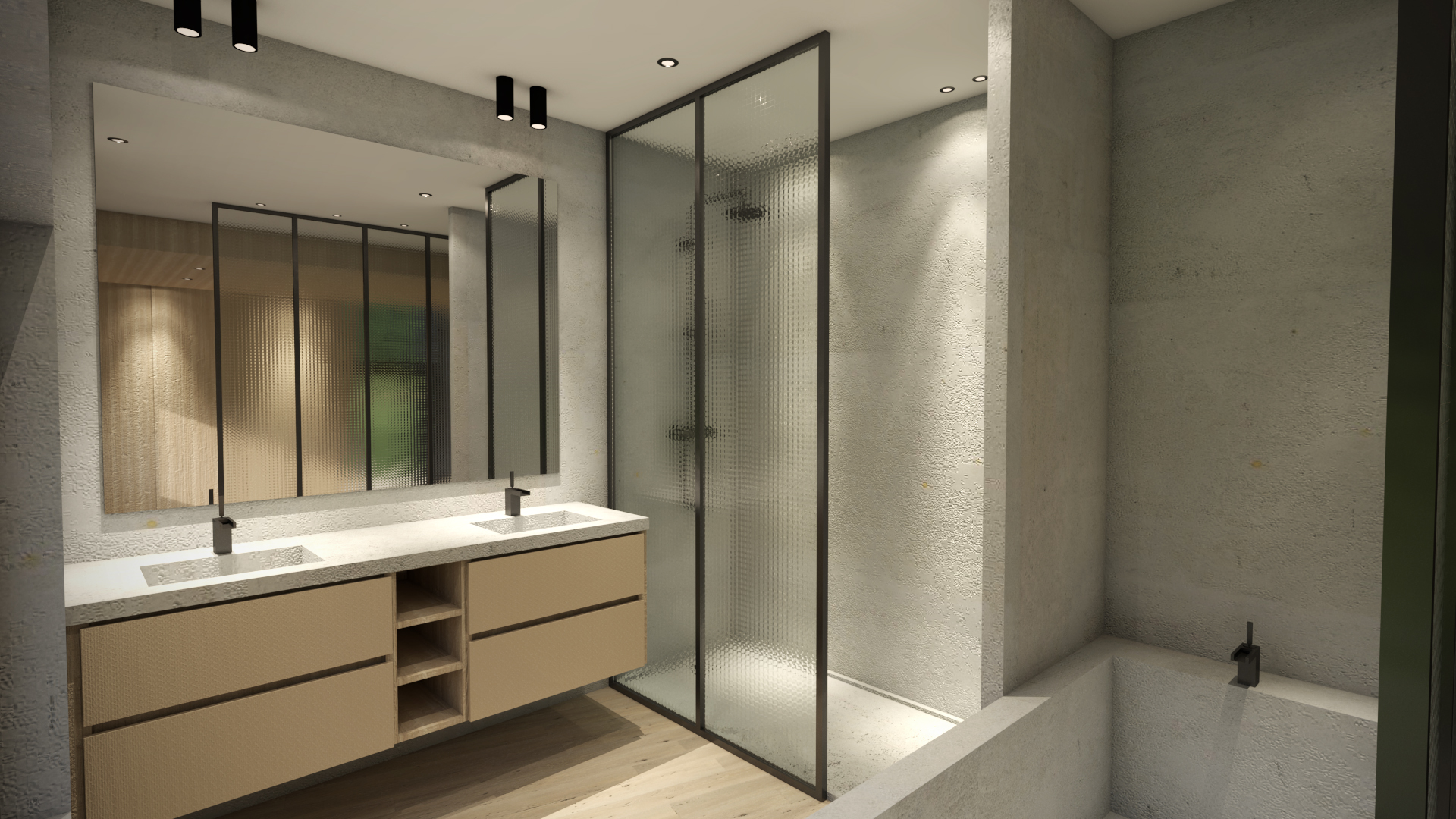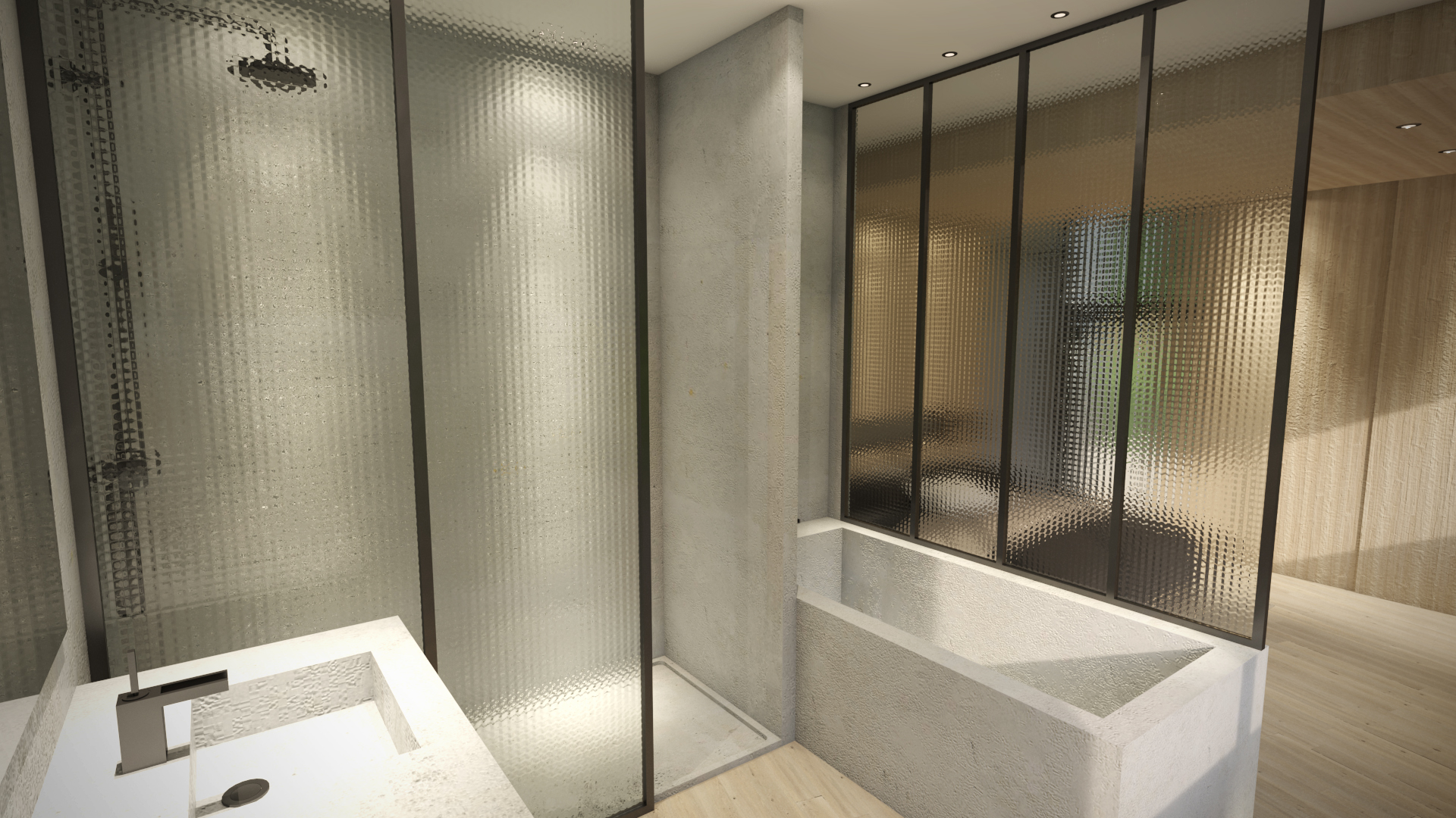 La salle de bain comporte une baignoire et une douche et est ouverte sur la chambre séparée par la présence de deux marches et d’une verrière. Du verre texturé est utilisé à la fois pour la verrière et pour la paroi de douche afin de créer un lien visuel tout en gardant de l’intimité.