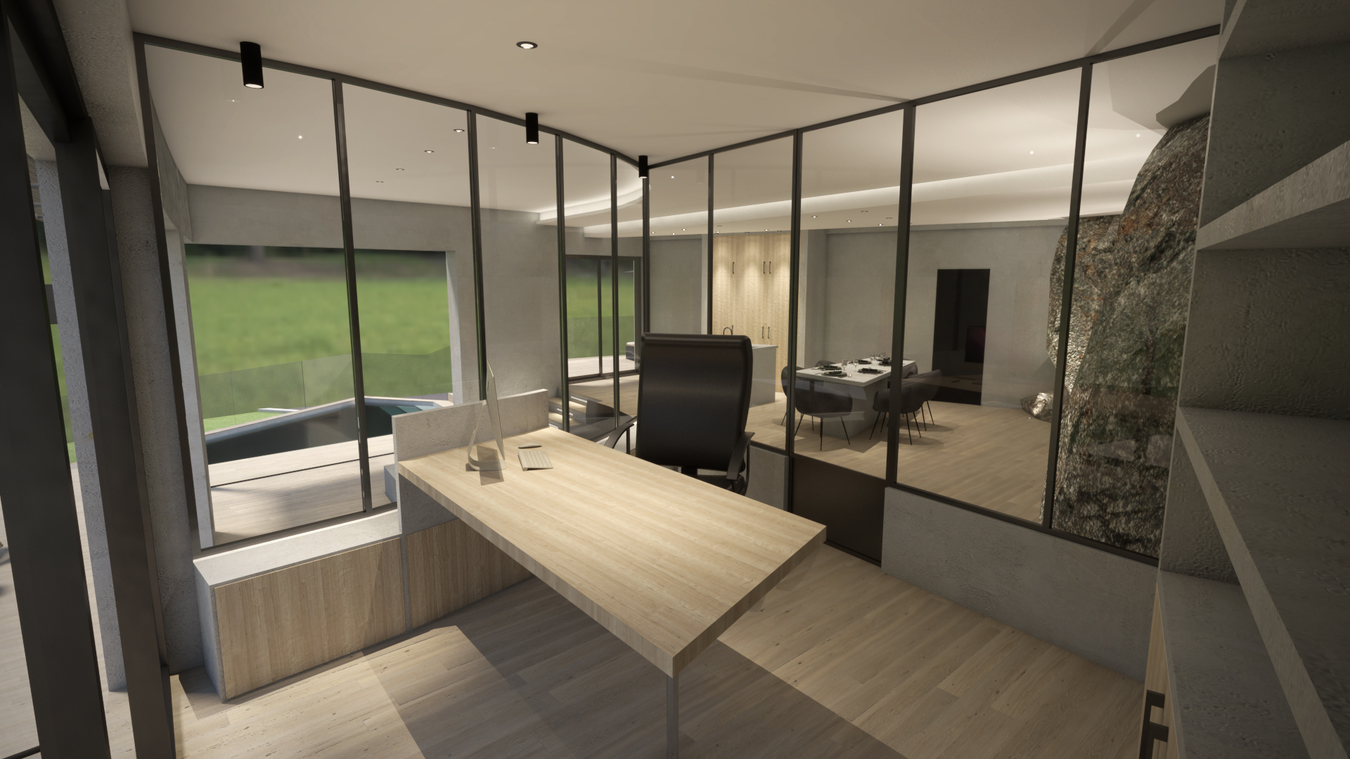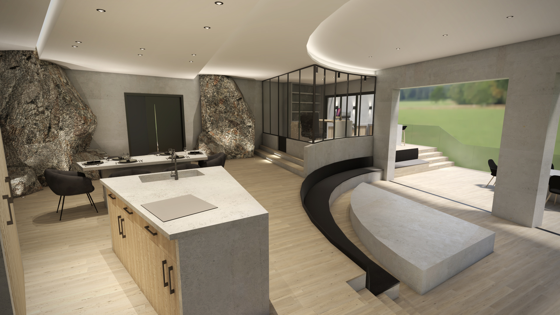 Les matériaux utilisés viennent en appui sur le relation intérieur/extérieur. Nous utilisons principalement le béton ciré qui vient rappeler une matière minérale, comme une roche.