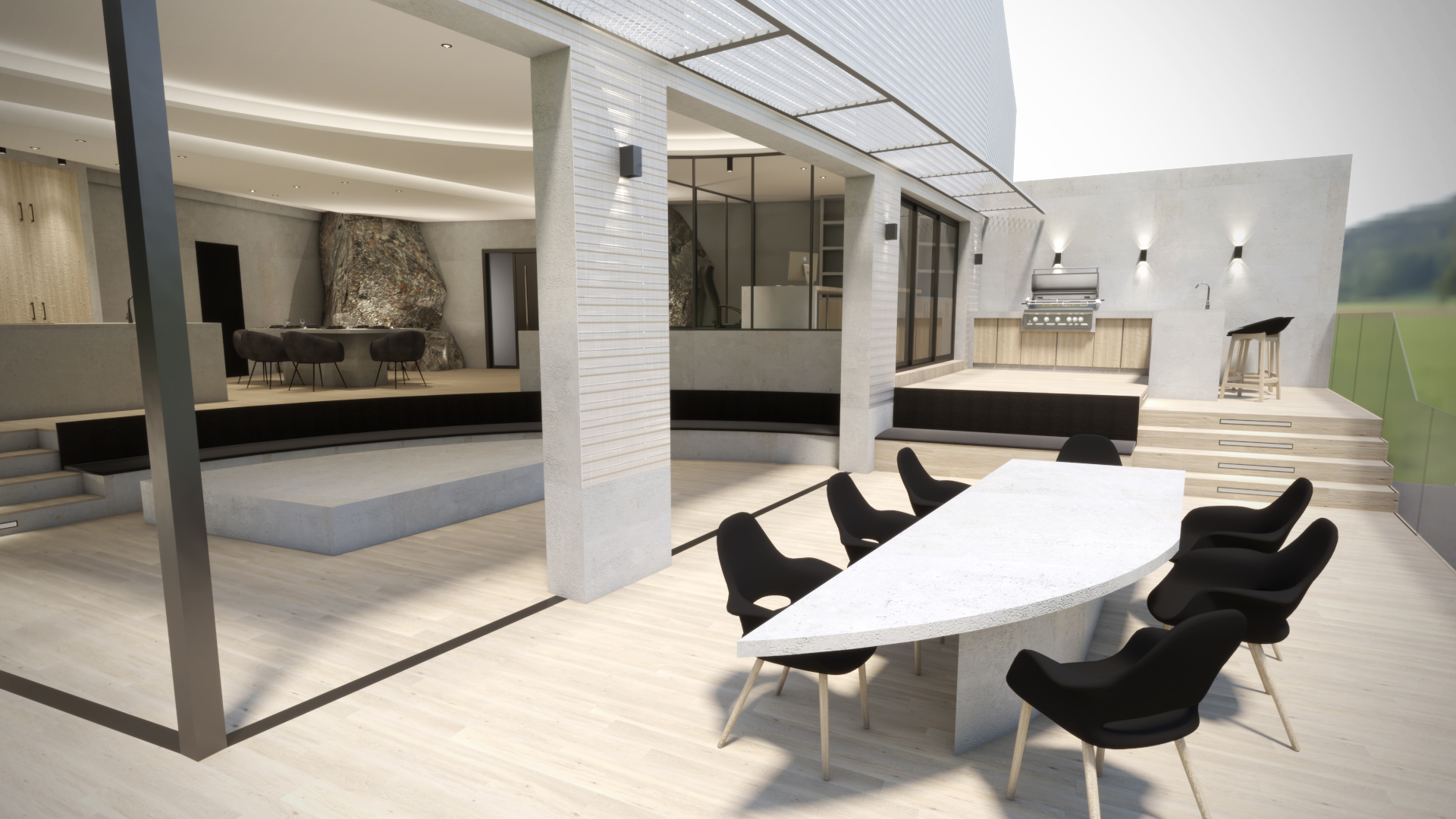 Les grands espaces ouverts offrent une impression d’espace qui est accentuée par la prolongation des espaces intérieurs sur la terrasse, accessible par les grandes ouvertures et des baies qui s’encastrent dans le sol pour générer