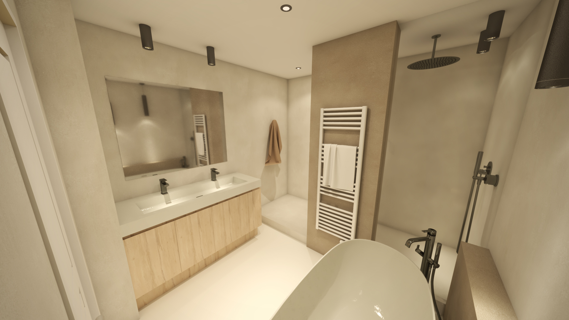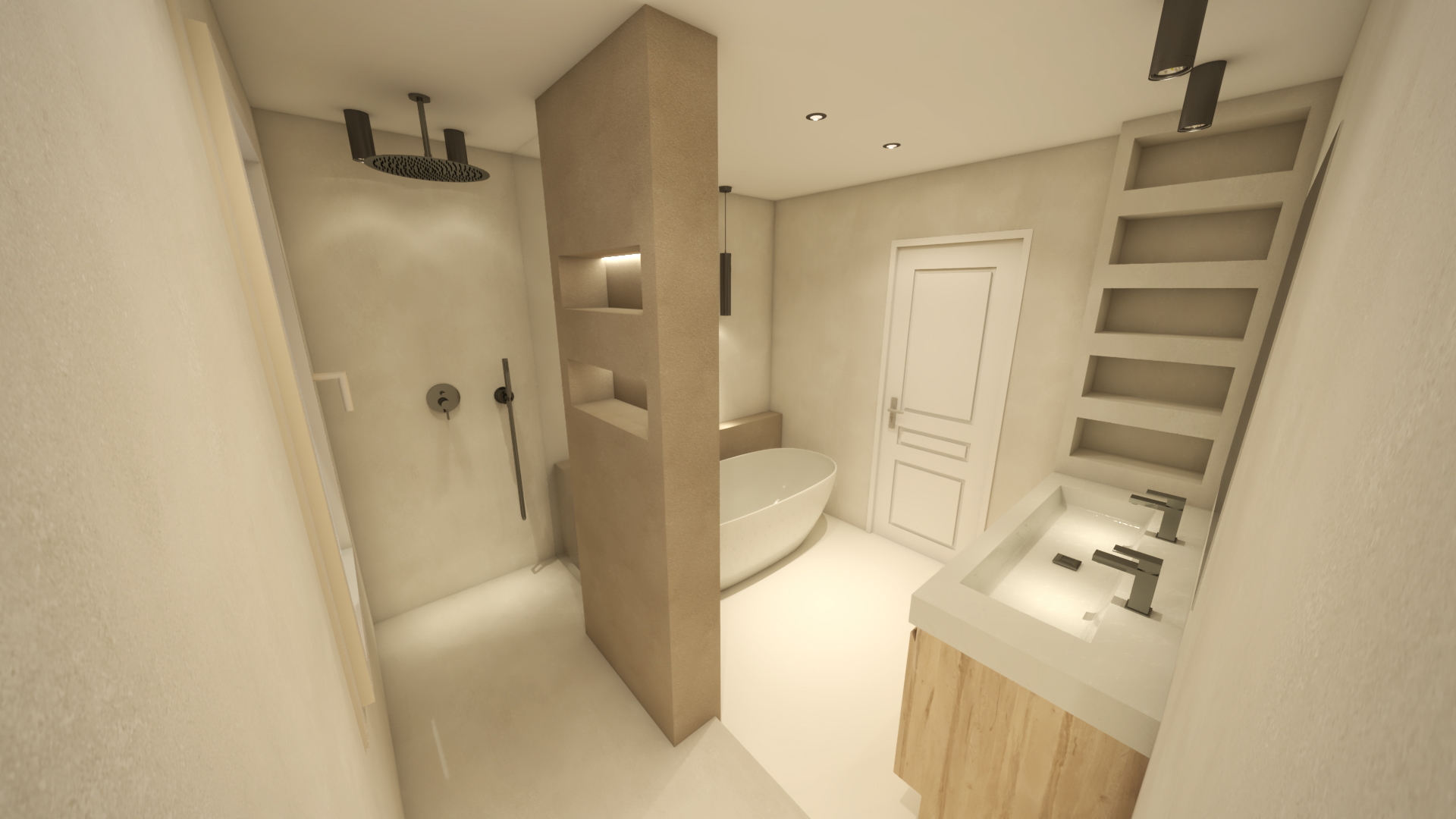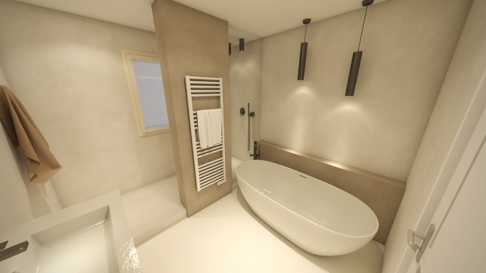 La distribution de l’espace a été totalement repensée pour intégrer une grande douche confortable et une baignoire ilot, tout en conservant les arrivées et évacuations d’eau présentes.