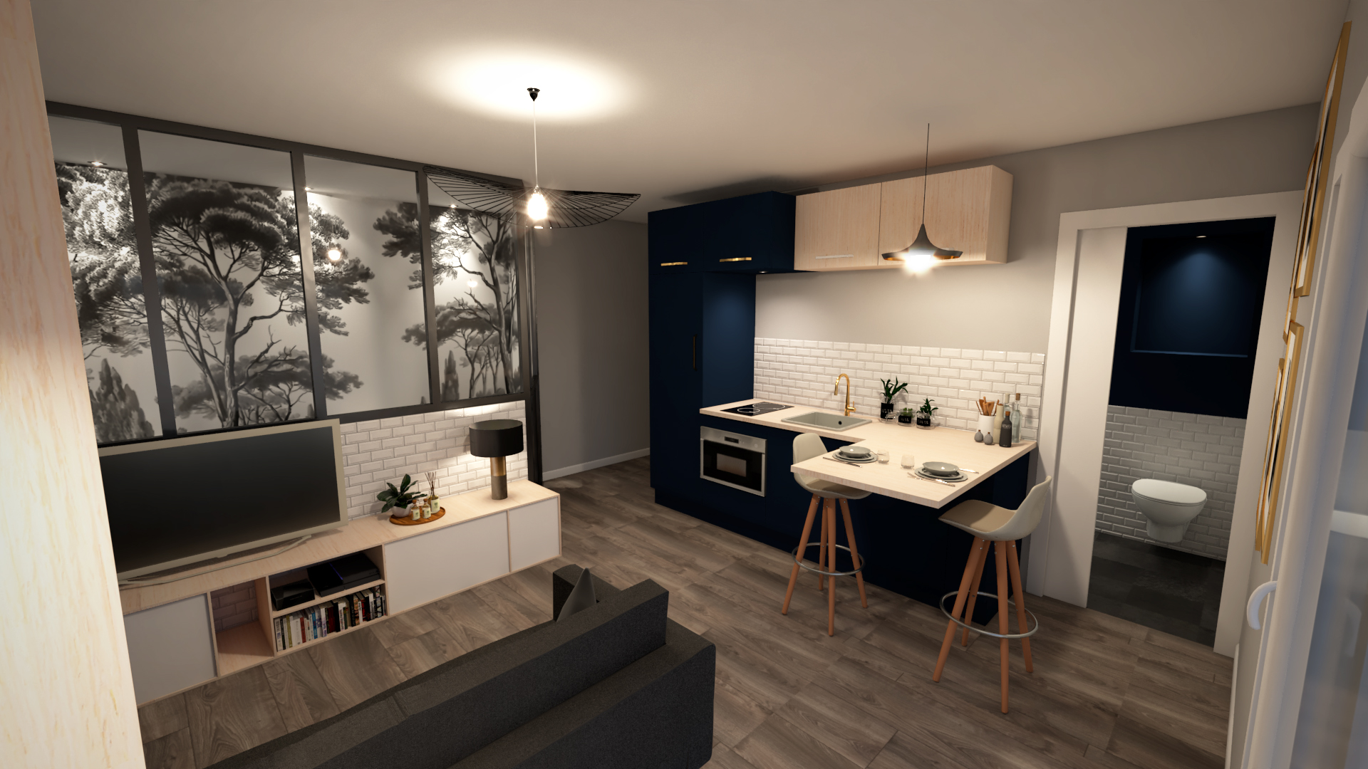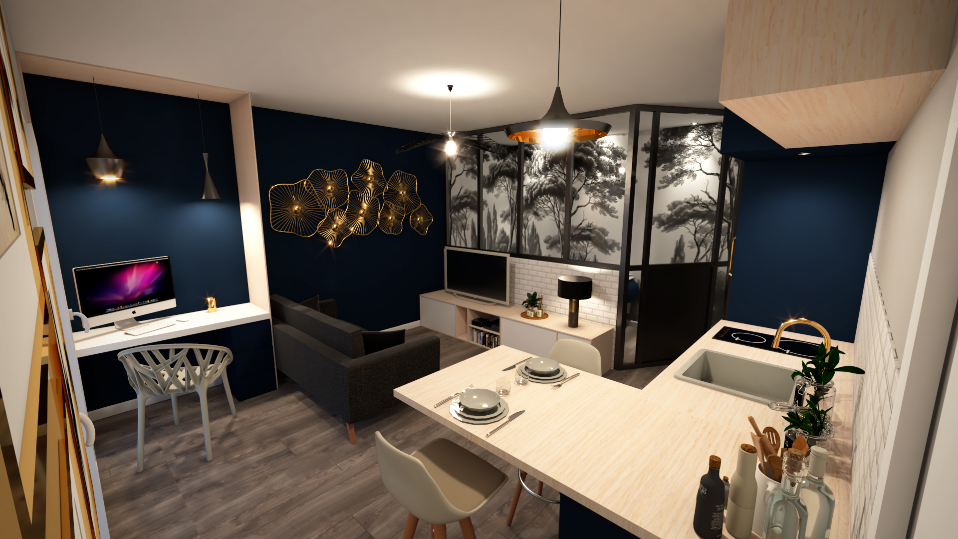 Le souhait était d’avoir un séjour qui peut servir de coin nuit, une petite cuisine, une salle d’eau et un coin bureau qui puisse être présent en permanence.