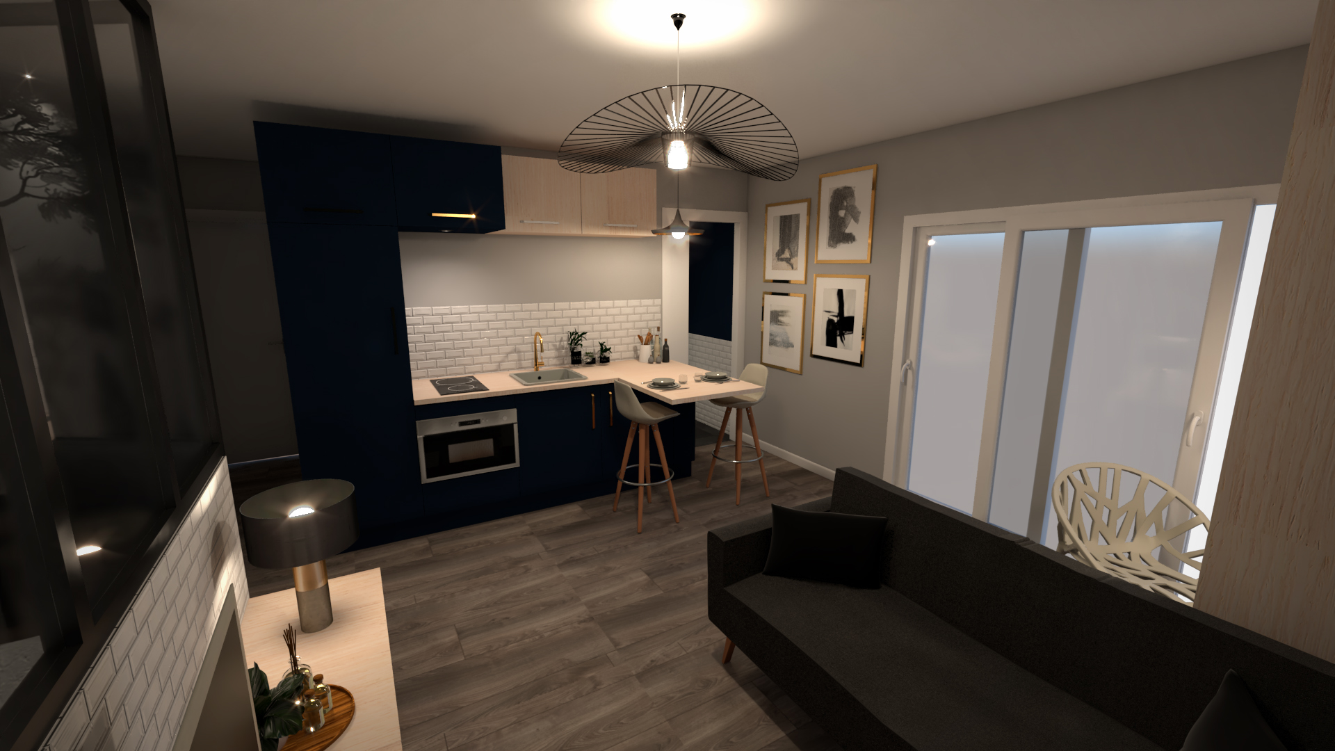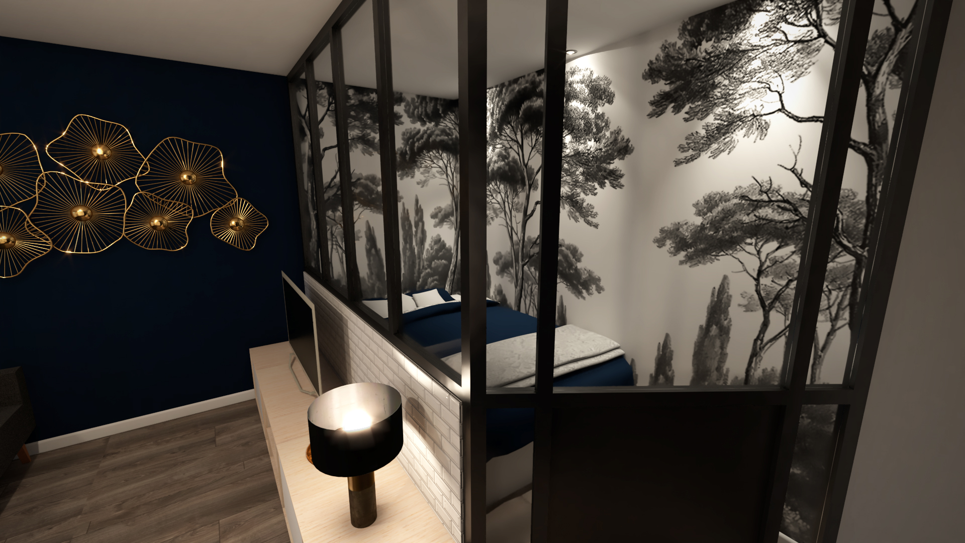 Comme je l’ai précisé, nous avons donc choisi de miser sur un séjour proposant à la fois un espace salon, une cuisine aménagée et un bureau fixe, mais surtout, une verrière disposée au fond de la pièce et délimitant un espace nuit permettant d’accueillir un lit de 140 x 200 et des rangements en dessous.