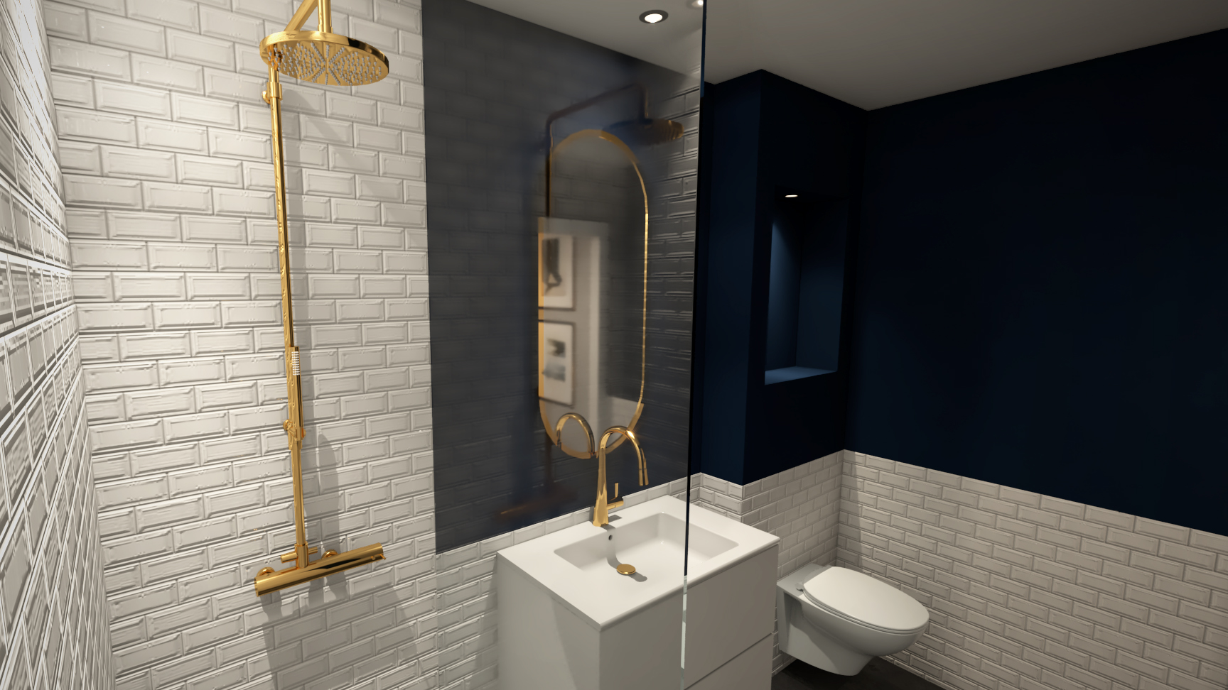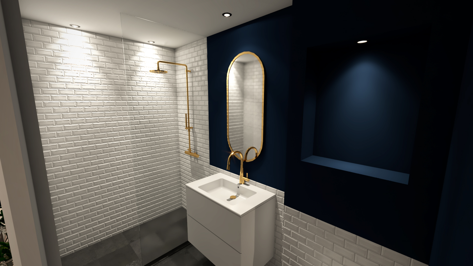 Cette pièce est mise en valeur grâce à des matériaux et des couleurs chics comme le bleu nuit, les carreaux de métro ou encore le laiton.