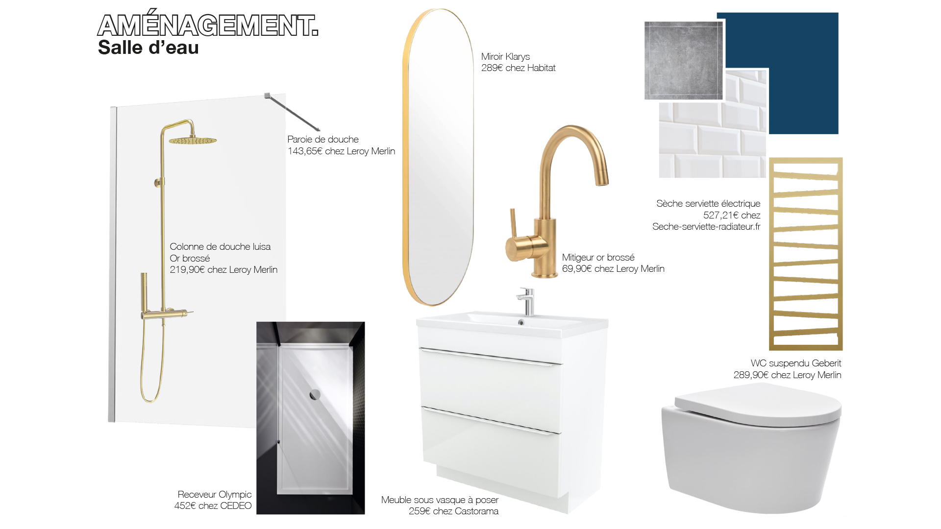 La salle d’eau présente donc une douche, un meuble vasque ainsi qu’un WC suspendu
